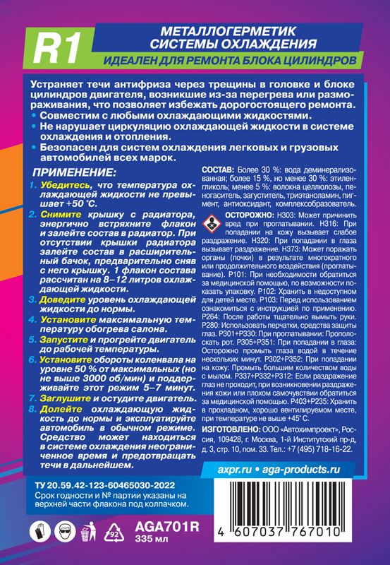Купить Металлогерметик для системы охлаждения AGA R1 335мл AGA-701R вы можете в компании Эксклюзив-Ойл , оформив заказ в интернет магазине, или отправив заявку по почте, а также по телефону или в офисе компании.
