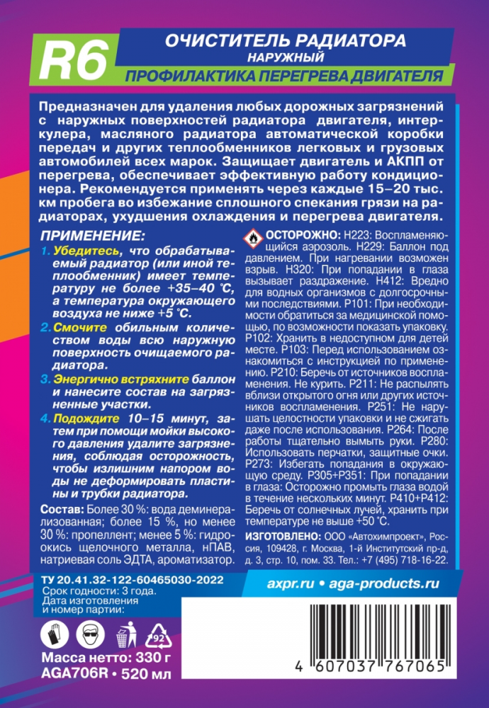 Очиститель радиатора наружный AGA R6 520мл AGA-706R